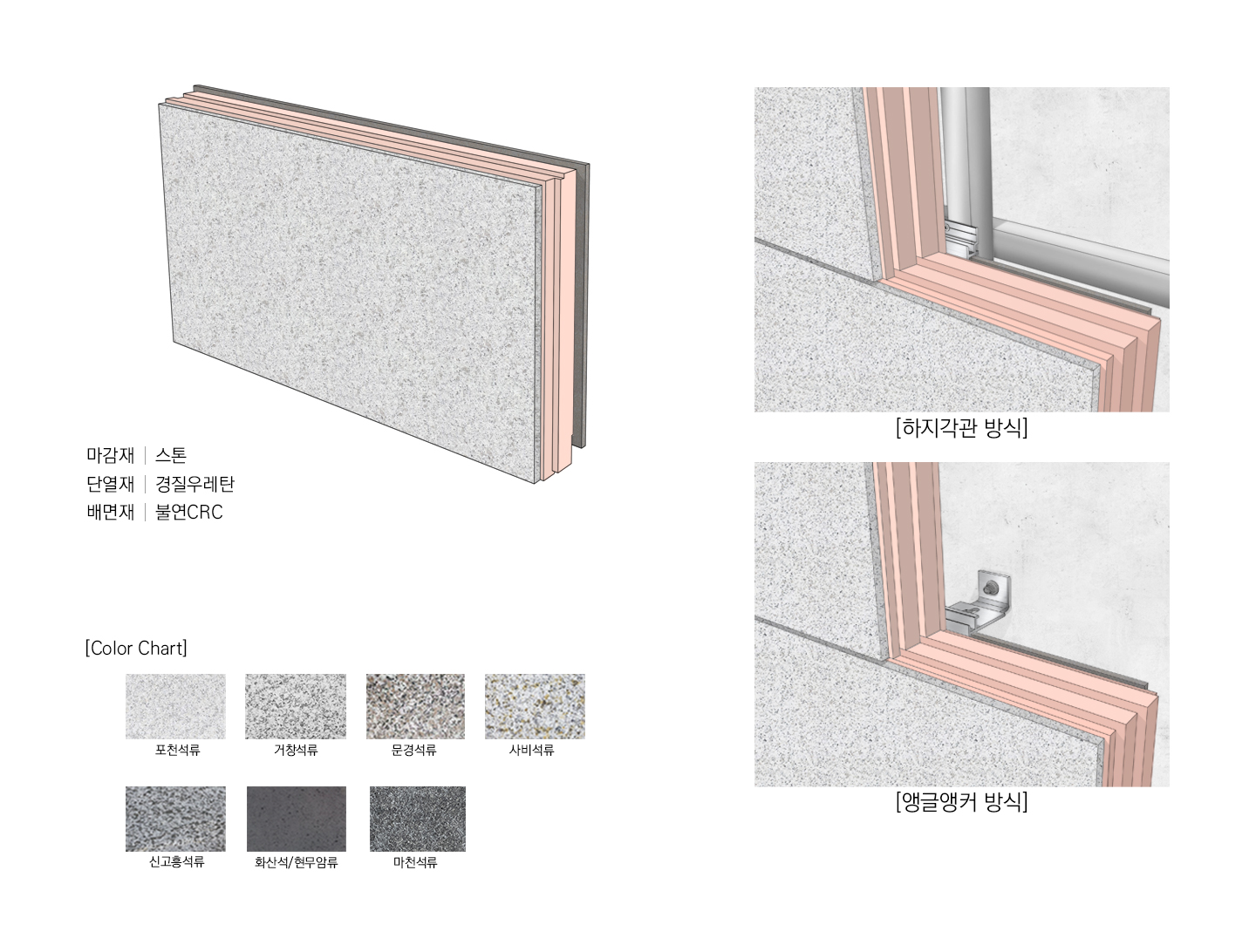 단열재와 외장재가 일체화된 패널형 제품으로, 외단열 공법으로 단열 공간을 절약하여 실내공간 확보에 유리하고, 공사기간을 단축 시킬 수 있습니다.